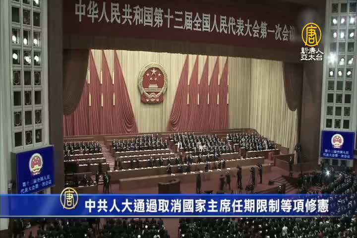 【新唐人亞太台 2018 年 03 月 12 日訊】歡迎回來,中共人大會議,星期天投票通過了取消國家主席、副主席任期限制的修憲條文。這次修憲還包括將習近平政治理論納入憲法等。中共人大普遍被外界認為是橡皮圖章。近3000人對修憲提案投了票,其中只有兩個反對票和三個棄權票。