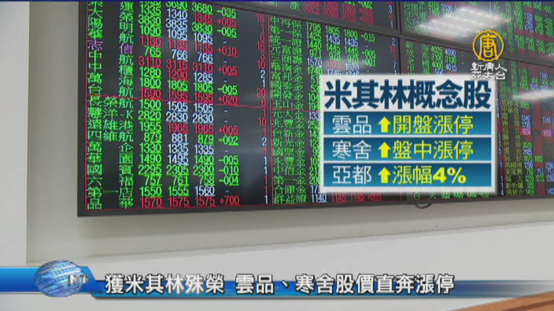 【新唐人亞太台 2018 年 03 月 15 日訊】台北米其林摘星餐廳揭曉,包括獲得三星的君品頤宮,二星喜來登請客樓,都讓集團雲品、寒舍股價直奔漲停,還有亞都、國賓、晶華等,米其林概念股綻放光芒,以及台積電等權值股撐盤下,台股不甩美股道瓊重挫影響,維持在平盤上下震盪,終場守住11000點大關。