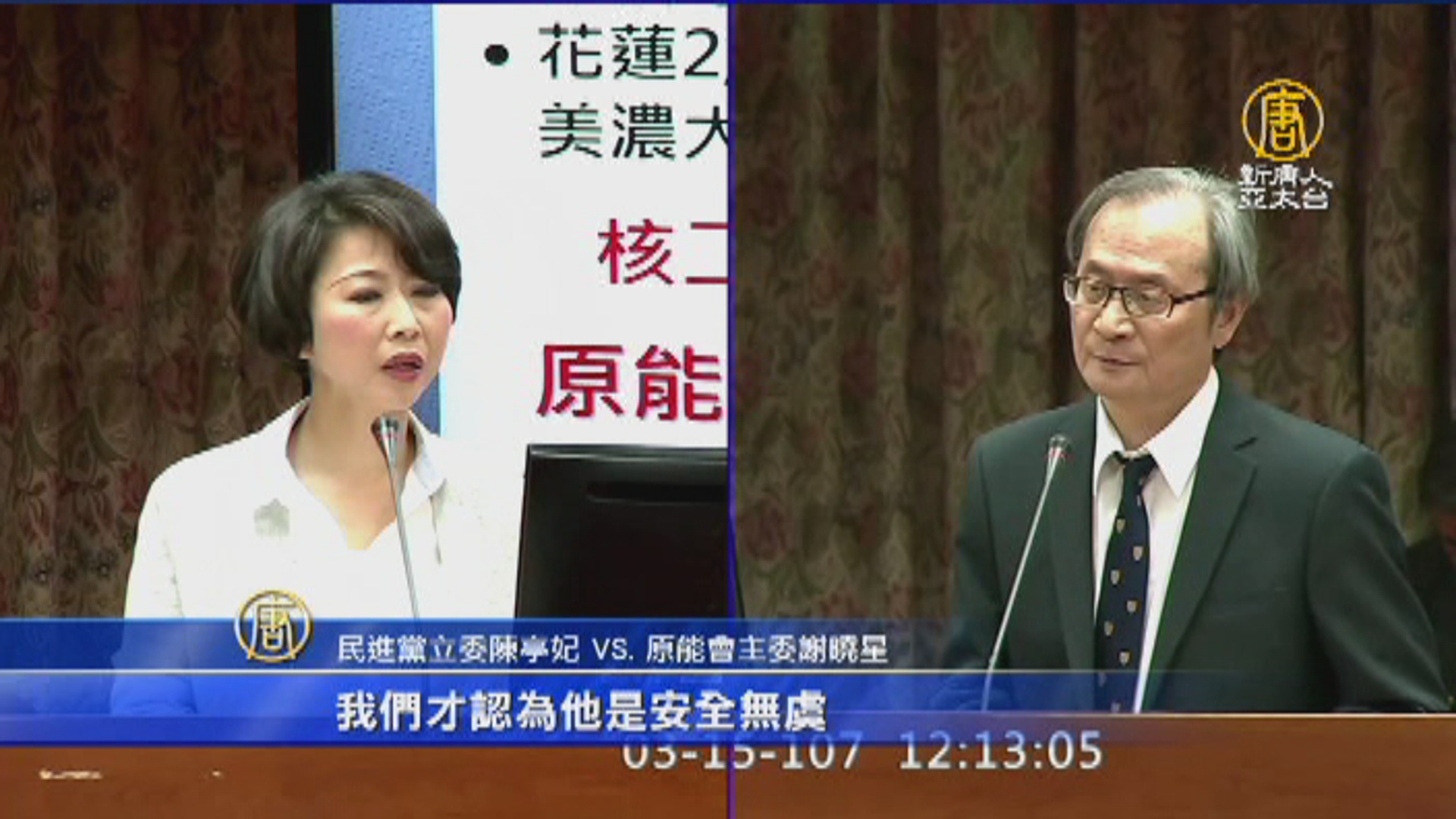 民進黨立委陳亭妃 VS. 原能會主委謝曉星:「我接了這個位子,既然2025非核家園,我就是反核,這是第一個,第二個,坦白講接了以後,我真的發現核廢料的處理,這是非常重要的問題,(很大的問題),是是是。」「相關的法規,我們徹底執行他相關的檢視,然後看到他徹底執行以後,我們才認為他是安全無虞,(所以他已經完成檢視了)是的。」