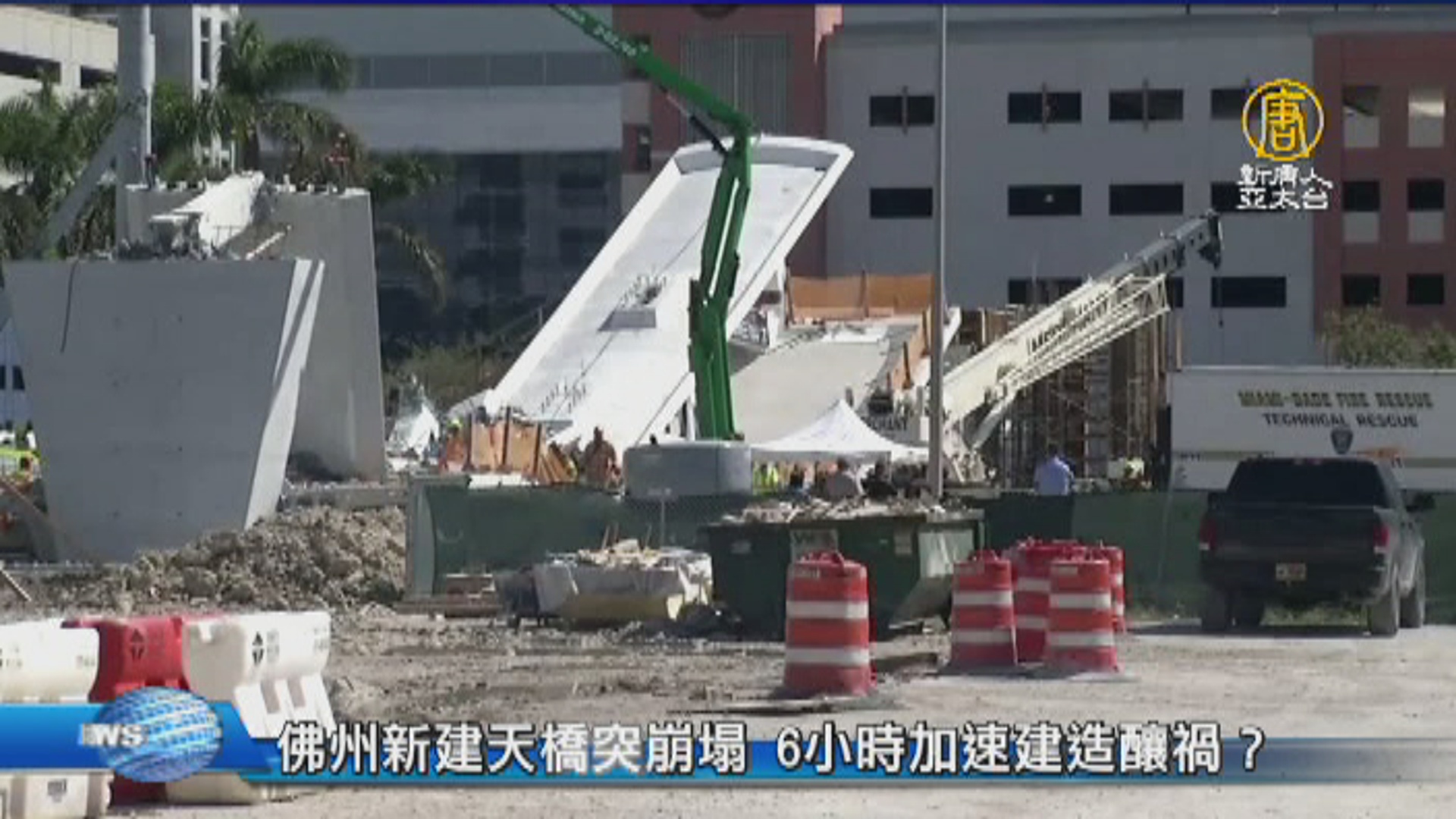 【新唐人亞太台 2018 年 03 月 16 日訊】歡迎回來。來看到國際一起不幸意外,美國佛羅里達國際大學一座全新行人天橋,在當地週四下午2點倒榻,至少造成4人死亡,多人重傷。美國聯邦調查官正對事故原因,展開調查。不過,有人質疑,這座新橋,在六天前才剛剛完成,且只花了六個小時建造,這種新型的加速建造法,是否是釀禍的原因。