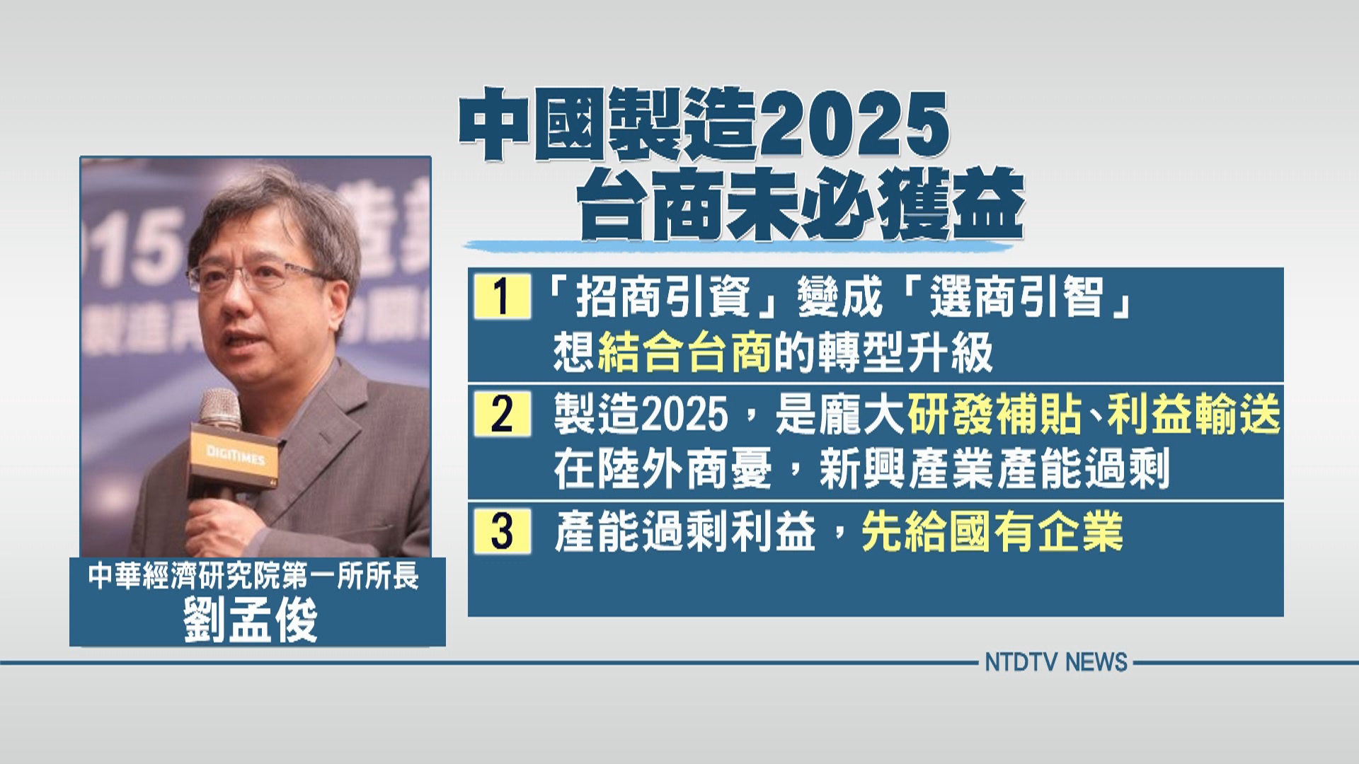中華經濟研究院第一所所長 劉孟俊:「中國製造2025,其實它本身是一個大量的研發補貼,是一個很大的利益輸送的管道。一旦啟動,可能對新興產業造成,所謂產能過剩一些問題。它會把產能過剩這任務交給台商嗎?或把這利益,會跟台商綁在一起嗎?我看未必,它可能首先會照顧,它地方的國有企業」