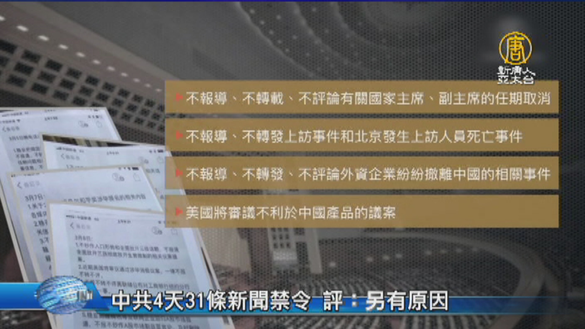 【新唐人亞太台 2018 年 03 月 17 日訊】中共「兩會」期間,網上流出中共宣傳部門的內部通知文件,四天之內禁令多達31條,其中包括中共歷來害怕的敏感話題,也包括一些普通的民生話題。外界認為,中共不出禁令才是新聞,不過今年的禁令多過往年還有其他原因。