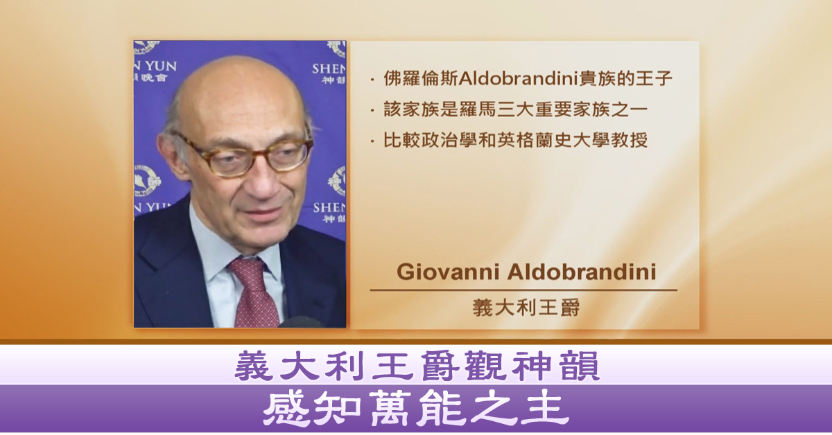 義大利梅爾多拉王子 Giovanni Aldobrandini: 「絕對(重要)我希望神韻繼續演下去。我希望神韻會成為與不同文化觸碰的一種力量,更好的理解中華文明的歷史,更好的明白自己是誰,感知萬能之主。我看到有一種意志,是每個神韻演員都擁有的,有一種力量,是一種強大的意志,在表演的諧和一致中體現出來,這正是演出的價值。有一種完美的協調。」