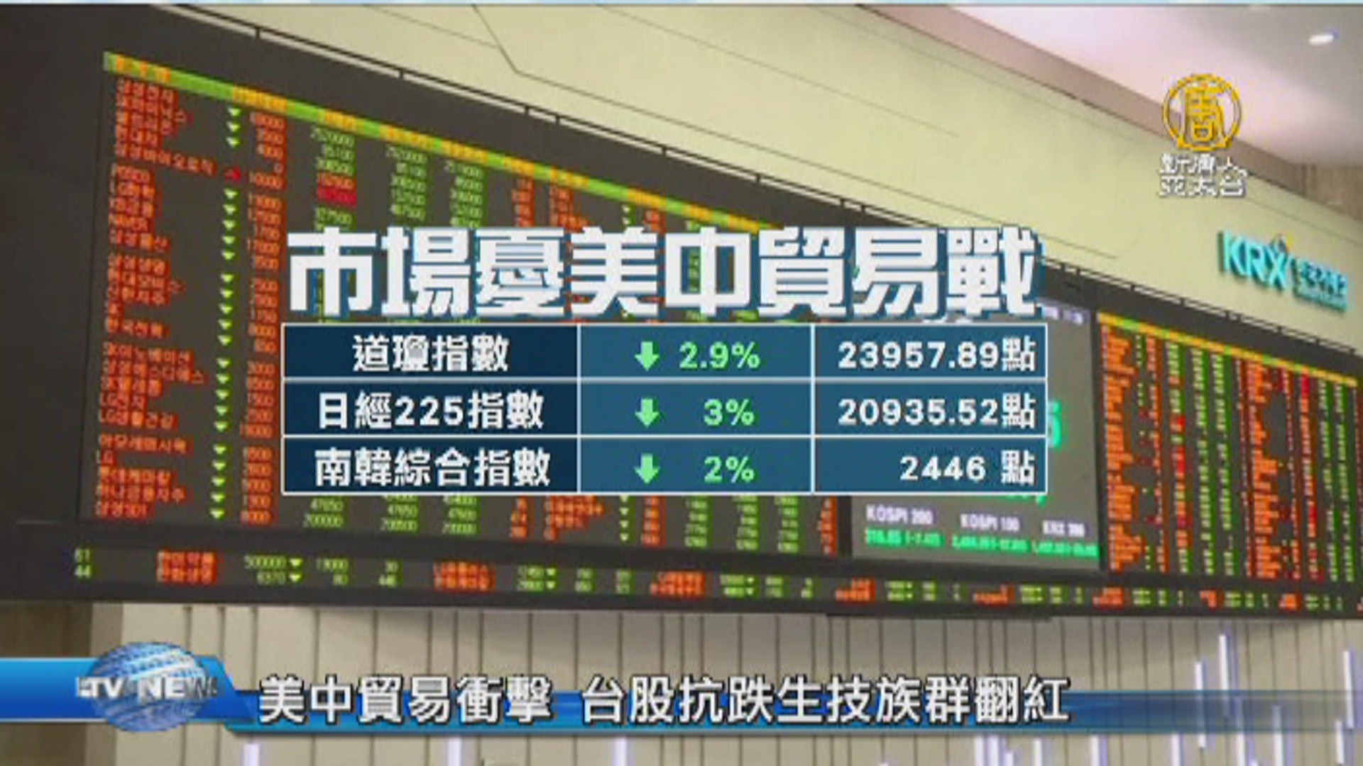 【新唐人亞太台 2018 年 03 月 23 日訊】好,美中貿易攤牌,投資人擔心中方報復,美股週四下跌超過700點,今天港股狂瀉千點,日股也暴跌800點,台股則是出現抗跌止穩的現象。