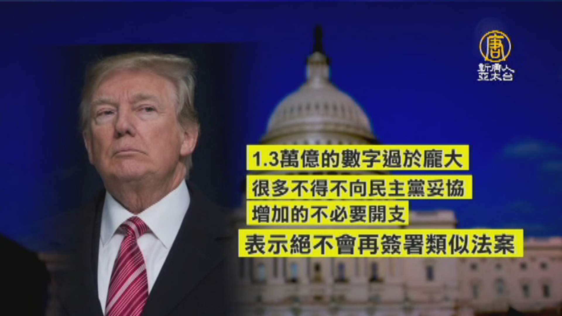 川普表示,他比任何人都對這項預算案感到失望,因為1.3萬億的數字過於龐大,而其中卻有很多不得不向民主黨妥協而增加的不必要開支,並表示今後絕不會再簽署類似的法案。