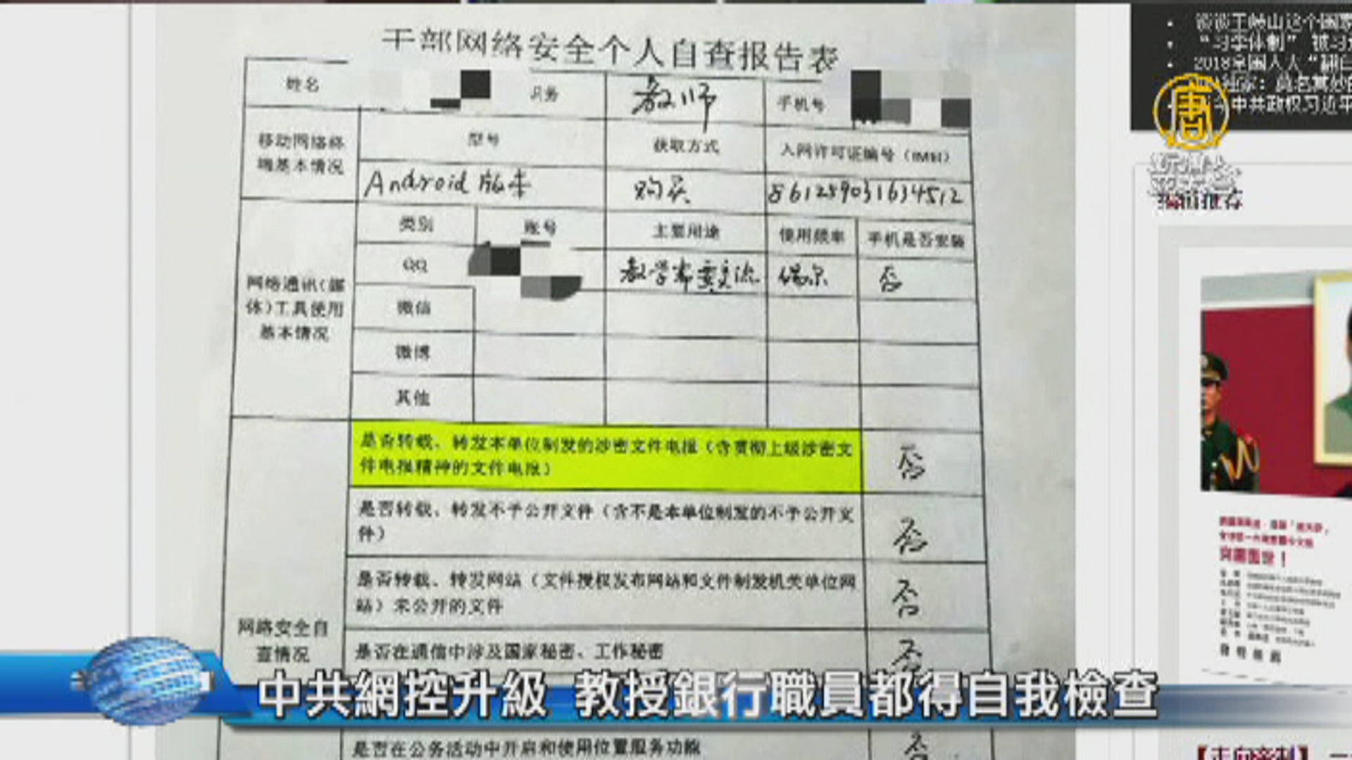 【新唐人亞太台 2018 年 03 月 27 日訊】中共網路監管再次升級。有大專院校、金融機構管理部門的員工,被要求填寫「網絡安全個人自查報告表」,內容得秉報個人網路使用狀況,是否安裝QQ、微信等軟體,甚至要求檢查社群平台的聊天內容。