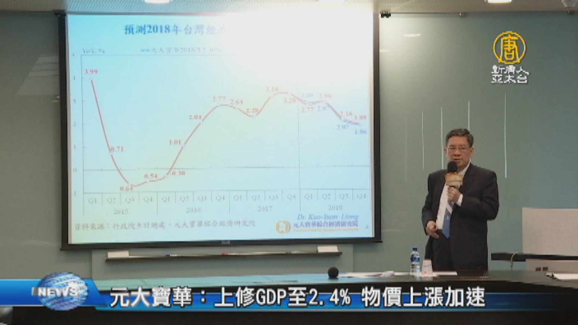 【新唐人亞太台 2018 年 03 月 28 日訊】隨著主要機構一致上修2018年全球GDP預測,今天,元大寶華綜合經濟研究院,也上修了今年台灣經濟成長率預測到2.40,並表示,物價上漲率明顯加速。