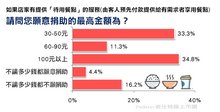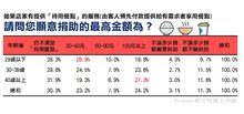 進一步以「年齡層」為基礎進行交叉分析,結果發現「29歲以下」受訪者最高願意捐助「30-50元」的比例較其他年齡層高,占28.9%;而「40歲以上」受訪者則以「100元以上」的比例較其他年齡層高,占27.3%,顯示隨著年齡之增長,呈現低捐助金額之占比越小,高捐助金額之占比越高之趨勢。