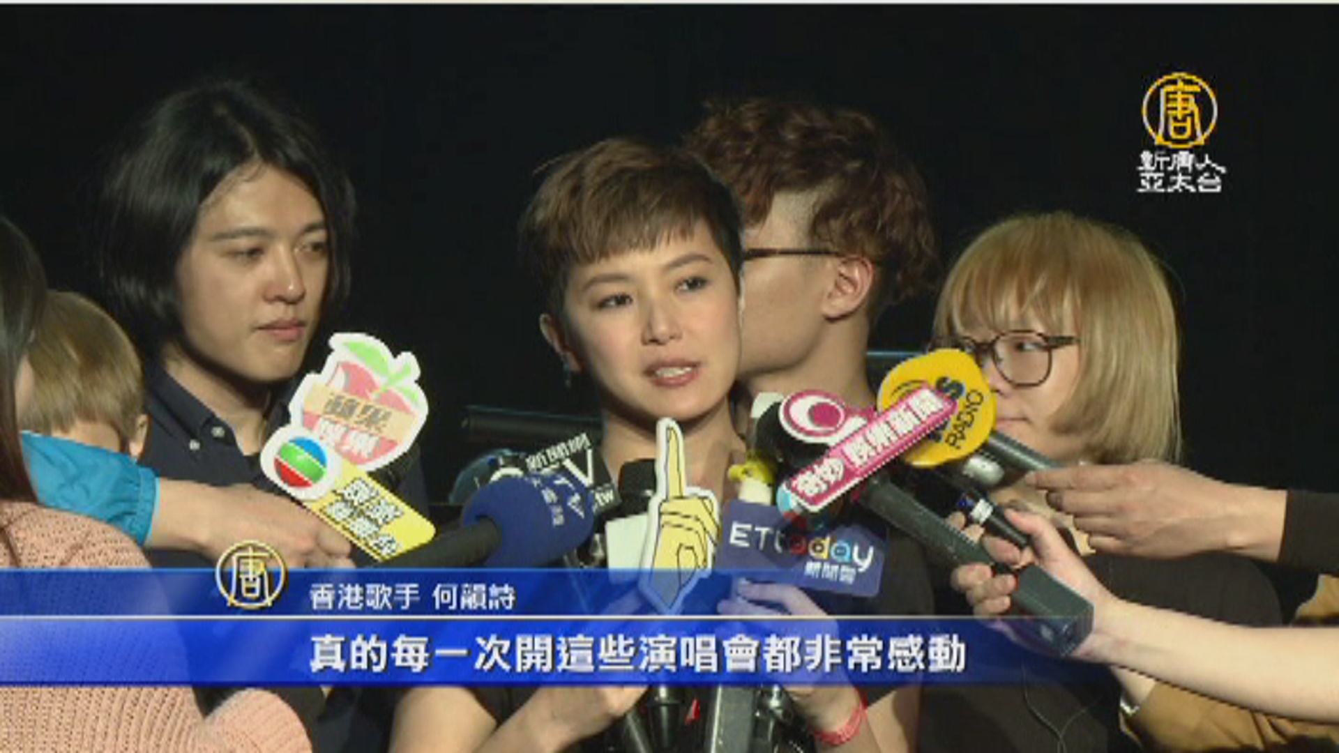 香港歌手 何韻詩:「真的每一次開這些演唱會都非常感動,因為畢竟我們現在是,沒有很多資源的一個,一個小唱片公司。那可以有很多人,除了自己的朋友以外,還有台灣的,有很多粉絲啊,路人啊,小店啊,他們之前都有幫忙去貼一些海報什麼的,那所以非常感謝大家。」