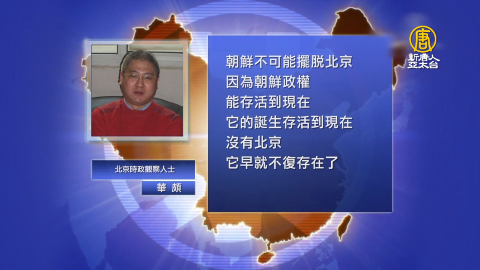 北京時政觀察人士 華頗:「北韓不可能擺脫北京,因為北韓政權能存活到現在,它的誕生存活到現在,沒有北京它早就不復存在了。美國之所以幾十年來沒有對北韓進行強硬的軍事消滅,完全是顧慮到北韓背後的北京政權。