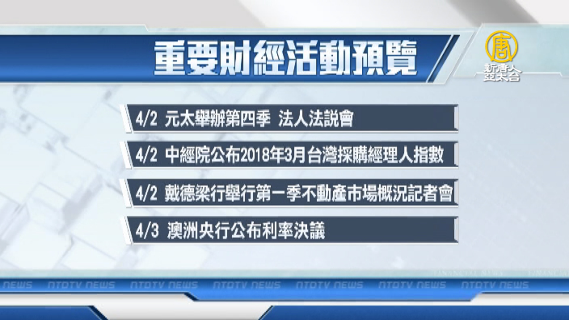 【新唐人亞太台 2018 年 03 月 31 日訊】帶您看到下週,有哪些重要的財經活動。