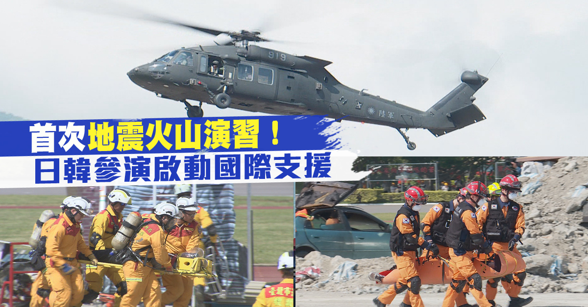 北市府31日下午在北投國防大學舉行年度災防演習,演習單位除了各縣市消防局,還結合了國軍部隊參演,並啟動國際支援機制,有來自日本東京、橫濱及韓國首爾的國際搜救隊到場支援,這次也是台灣首度模擬地震、火山爆發情境的實兵演練。