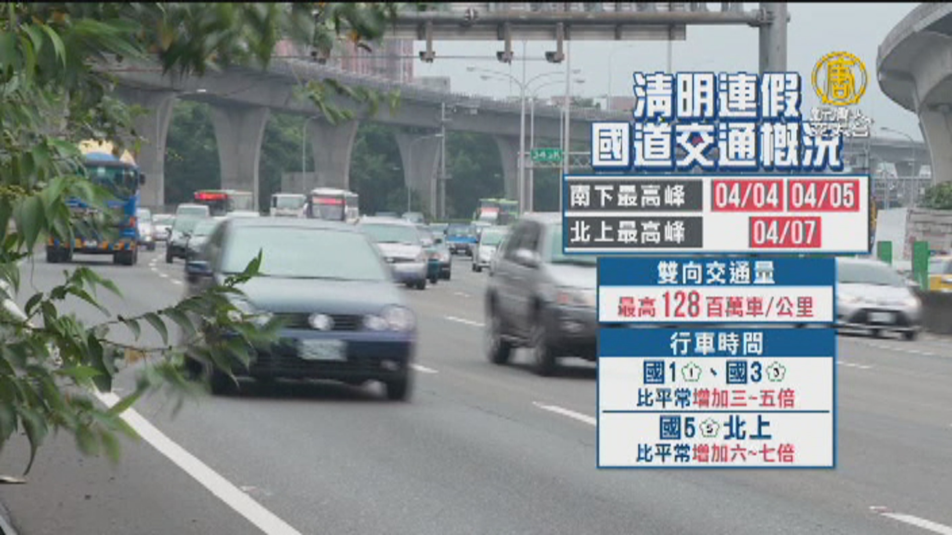 2018-04-05 21:04:30新聞一開始,馬上來看到,今天是清明節,國道湧現掃墓以及出遊車潮,尤其是國5,一早就湧入大量車流,下午開始也出現北返車潮,預估明天國5北上,可能會從午後塞到深夜。為了緩解被稱為「史上最塞清明連假」的車流。高公局稍早(5)日宣布,從明天開始,國道5號北向高乘載管制時段將延長,調整為下午2點到晚間9時。