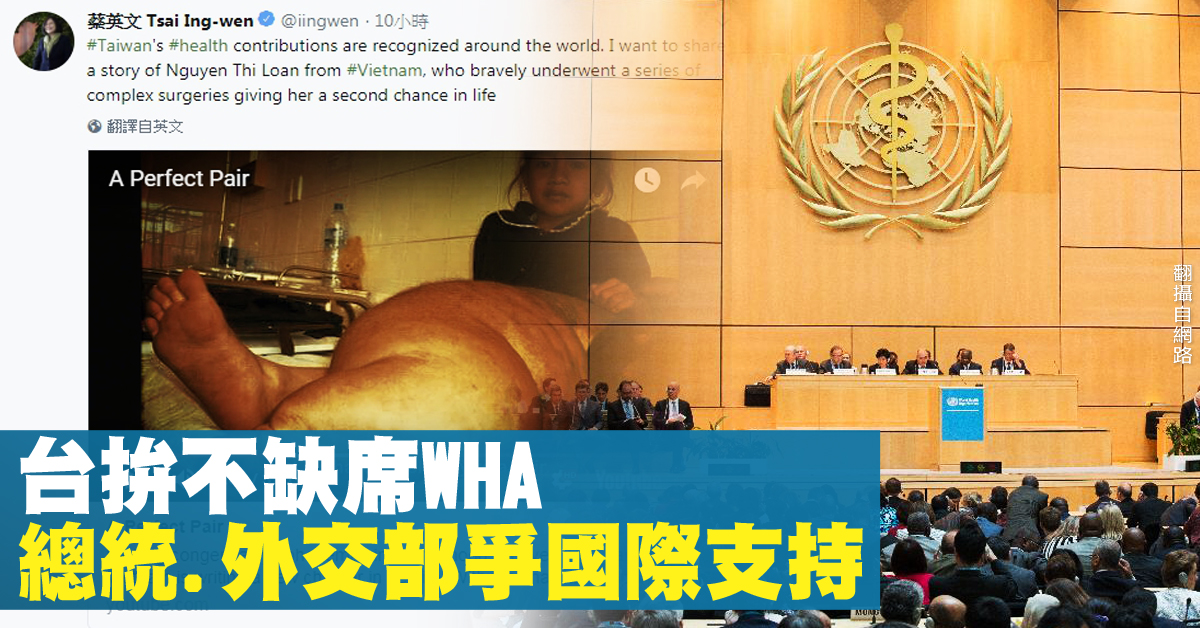 【新唐人亞太台 2018 年 04 月 03 日訊】繼續來看到,今年的世界衛生大會(WHA)5月將在日內瓦召開,雖然台灣獲邀參與的機會不大,不過,總統蔡英文今天在推特上,分享外交部製作的國際醫療短片「阿巒的作文課」,並寫道,台灣的醫療貢獻全球周知,阿巒勇敢地接受一連串複雜的手術,也因此有了人生第二次機會。而外交部也已通電所有友邦,友邦將在4月7日的「世界健康日」為台灣提案,提案主題是「邀請台灣以觀察員身分參與世衛大會」。