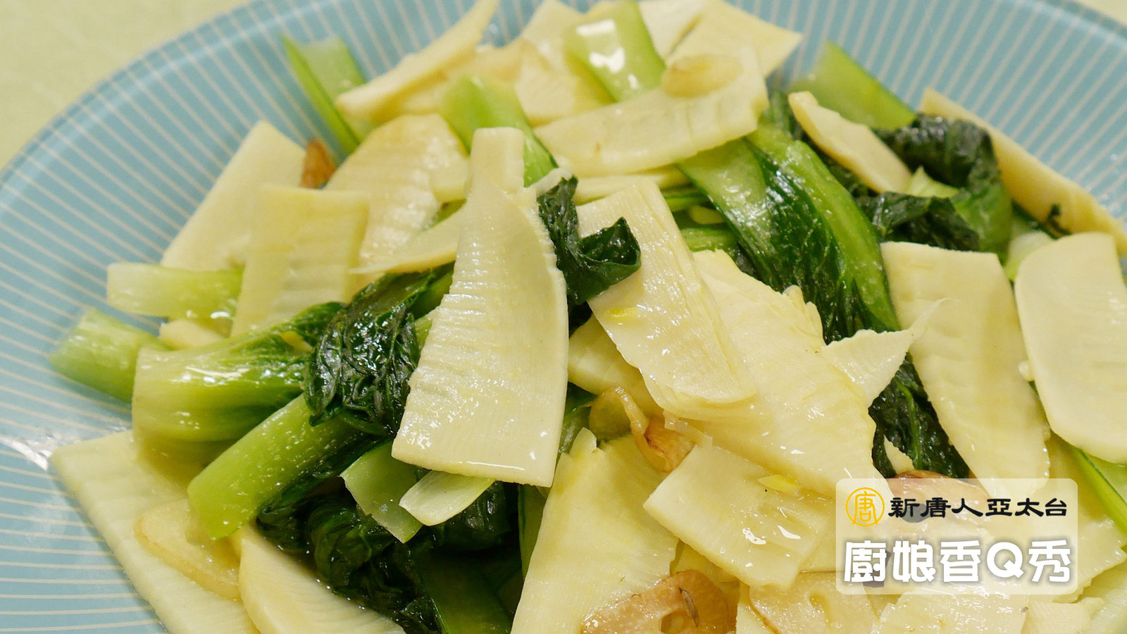 3.冬筍蒸熟,另取一鍋子倒入蒜片爆香,加入托咕菜、高湯一同燜煮,並加入筍,調味,盛盤。