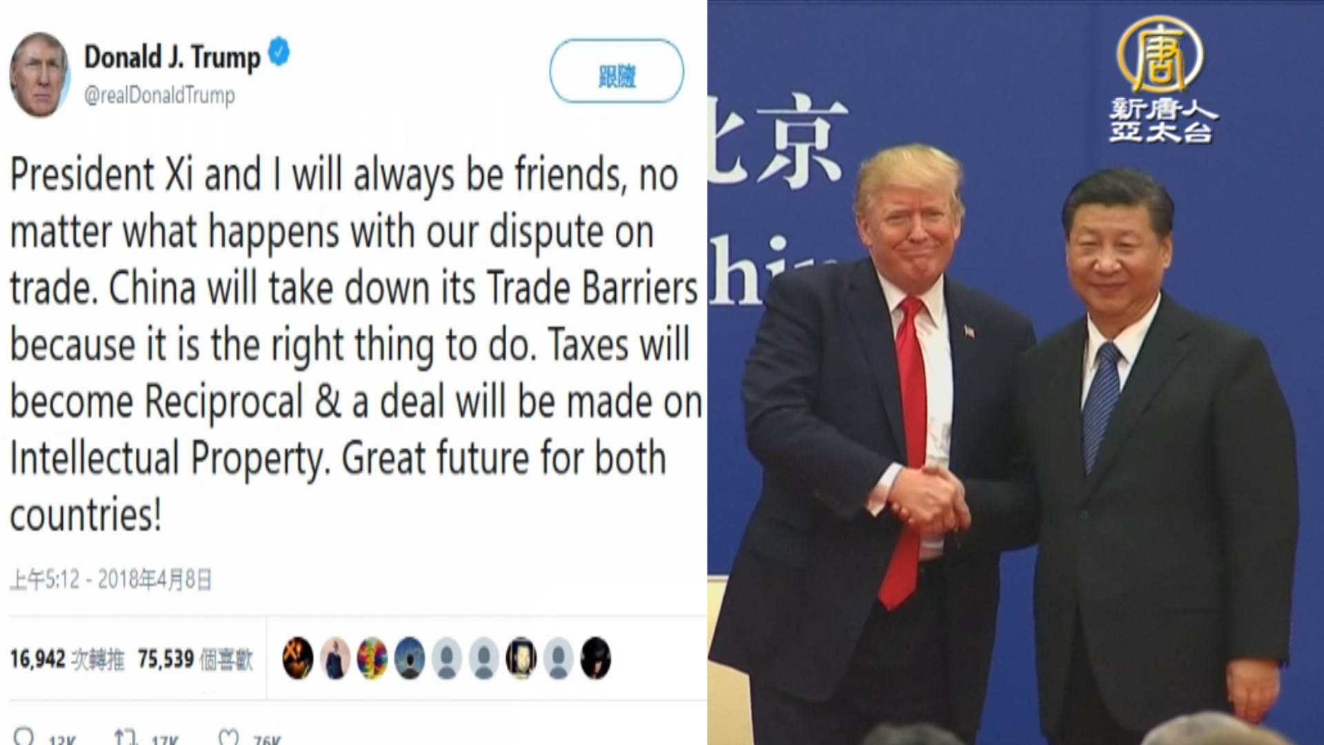 【新唐人亞太台 2018 年 04 月 09 日訊】中國即將在明天舉辦博鰲論壇,美中貿易問題受矚目,美國總統川普最新在推特上發文,表示「中國將會拆除貿易壁壘,因為這是正確的。稅將會是互惠的,並且智慧財產權的協議也會達成。兩國都會有光明的未來!」,川普還說與習近平永遠都會是朋友;有日媒披露,習近平可能明天在論壇上向川普釋放善意回應。