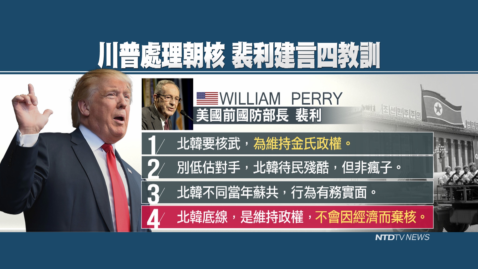 美國前國防部長 裴利(William Perry):「當他們(北韓)為了改善經濟而談判時,那不是底線。(北韓的)底線是,維持政權。他們不會拿政權的生存來交易,以換取改善經濟。北韓不會因為經濟制裁,放棄核武器。」