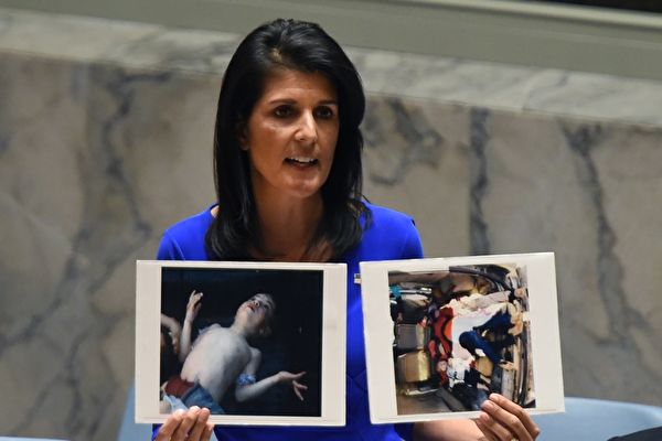 2018年4月7日,敘利亞再傳化學武器攻擊,聯合國安理會為此召開會議,美國和俄羅斯分別提出決議草案,呼籲建立獨立調查機制。圖為2017年4月5日,美國常駐聯合國代表黑莉(Nikki Haley)譴責敍利亞以化學武器濫殺無辜。( TIMOTHY A. CLARY/AFP/Getty Images)
