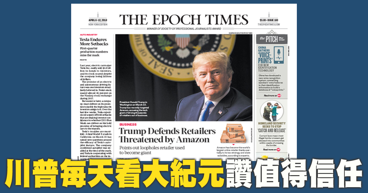【新唐人亞太台 2018 年 04 月 16 日訊】《大紀元時報》報導,最近,大紀元從多個渠道獲知,美國總統川普經常看英文大紀元。正在角逐加州聯邦參議員席位的共和黨參選人保羅.泰勒 近日表示,他得知,川普總統天天都看英文大紀元,並且稱讚大紀元真實報導,是值得信任的媒體。