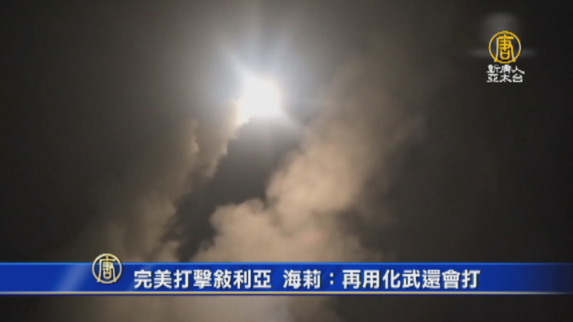 【新唐人亞太台 2018 年 04 月 16 日訊】國際消息關心敘利亞危機,美國駐聯合國大使海莉在接受採訪時表示,川普總統推文所說的「任務完成」,指的是週末導彈襲擊敘利亞這次單一任務,如果阿塞德政權再次使用化學武器,美國還會實施打擊。