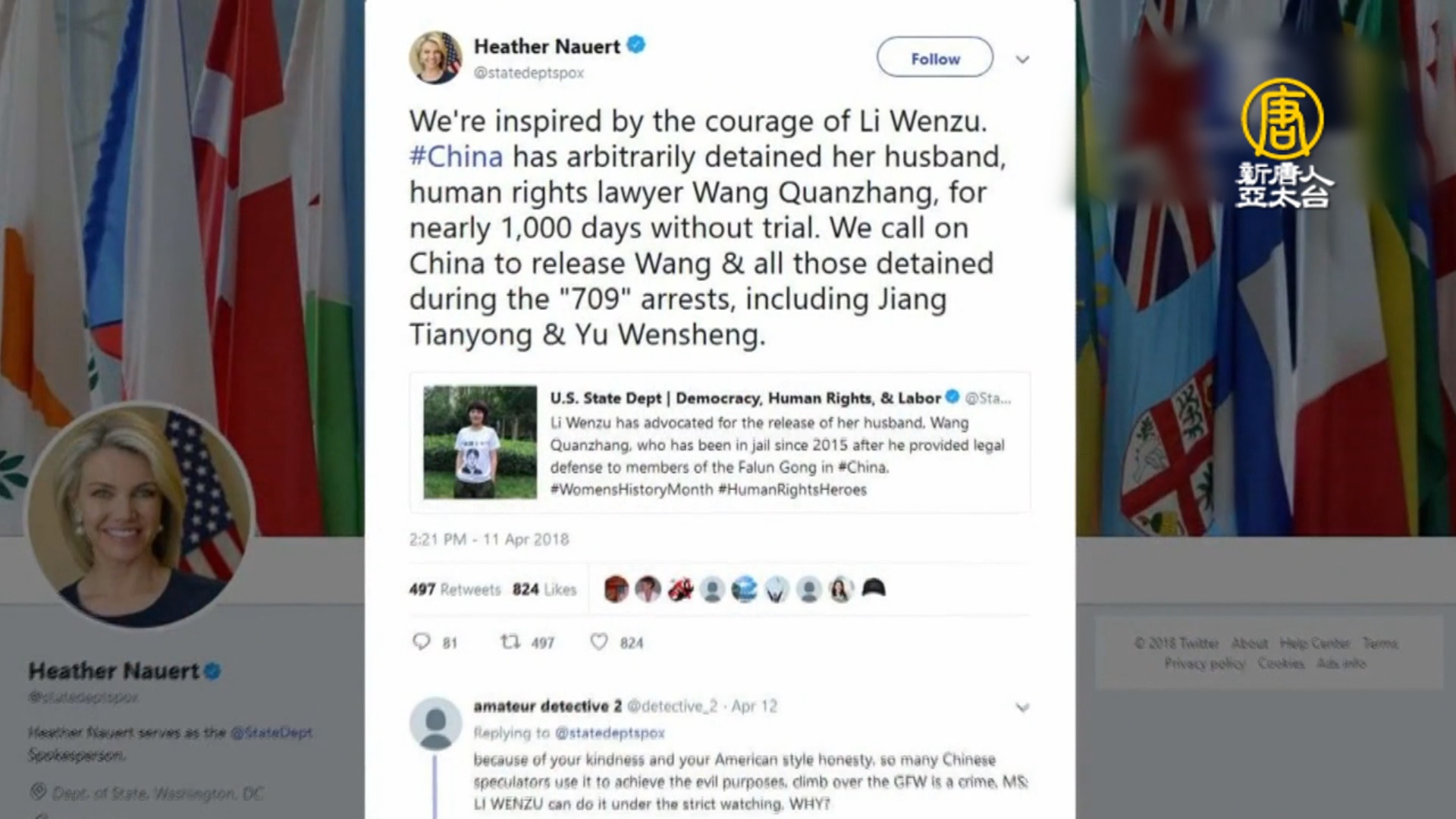 美國國務院發言人希瑟•諾爾特(Heather Nauert)在官方推特上聲援李文足,同時呼籲釋放與709案有關的江天勇和余文生律師。