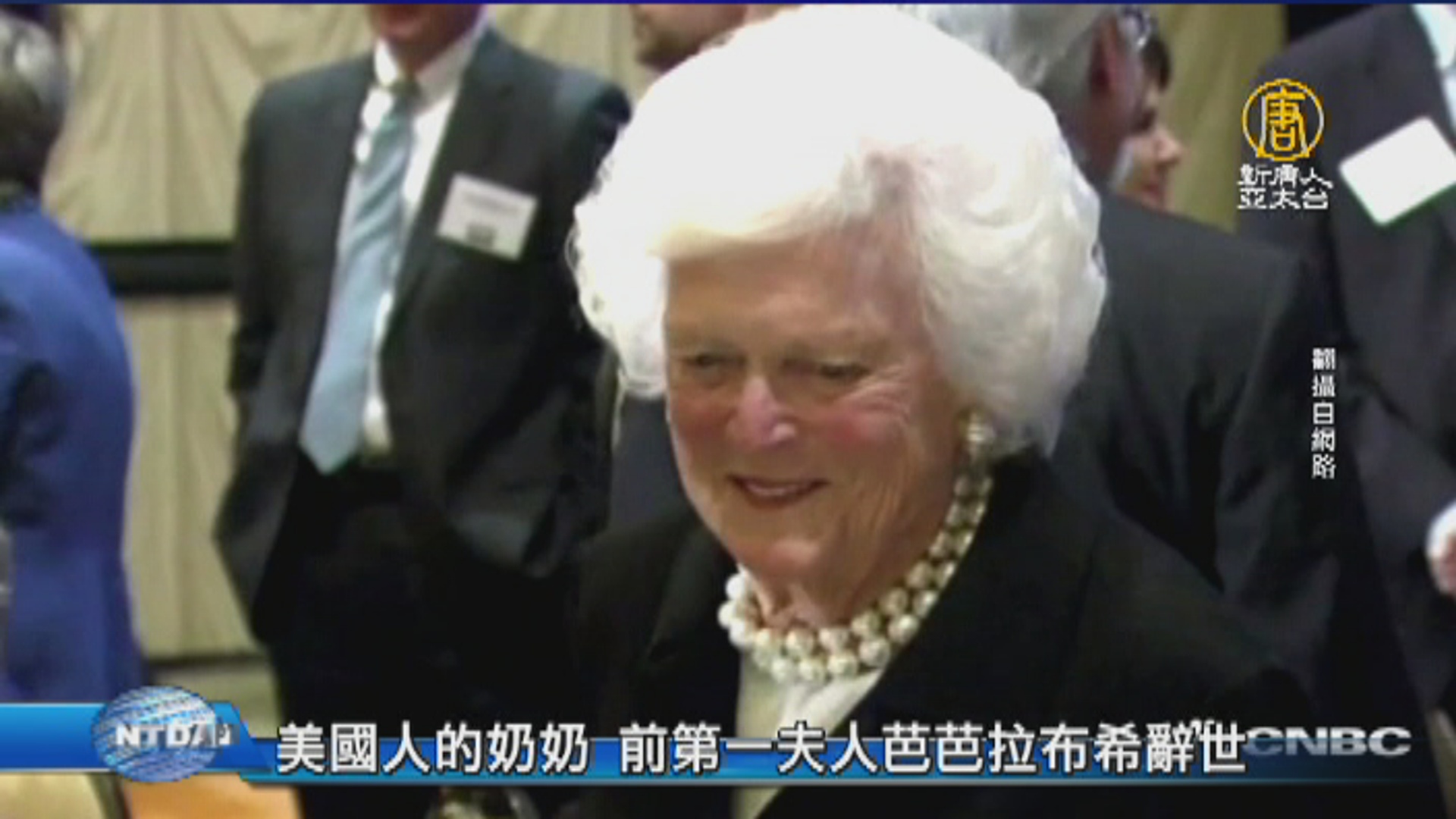【新唐人亞太台 2018 年 04 月 18 日訊】歡迎回來。美國前第一夫人芭芭拉.布希於17日病逝,享耆壽92歲。芭芭拉是老布希總統的妻子,小布希總統的母親,是唯一見證丈夫和兒子宣誓,成為美國總統的女性。在擔任第一夫人期間,芭芭拉致力推動全民識字,以一頭白髮的親民形象,成為美國人的全民奶奶。