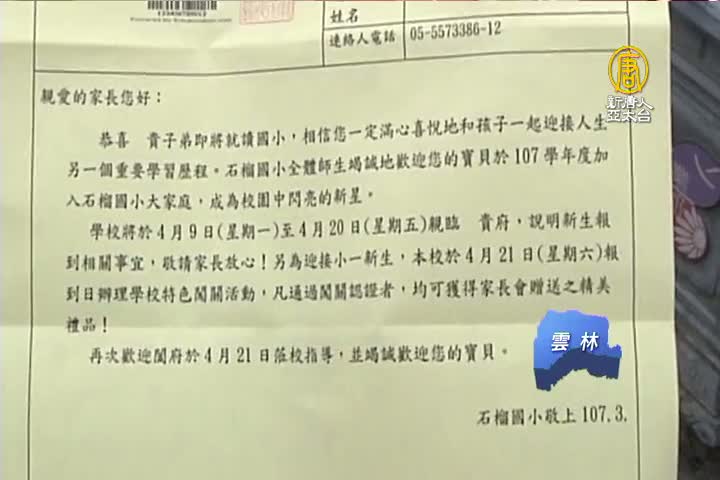 石榴國小校長 蔡正龍:「我們就仿召集令的方式,讓家長收到的時,可以很用心去看這一張『召集令』,新生要報到的時間,還有地點,也(讓家長)了解學校在對新生來報到的用心。」