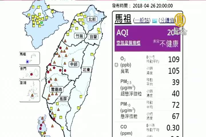 【新唐人亞太台 2018 年 04 月 27 日訊】再來關心,中國大陸臭氧飄來台灣,環保署表示,昨天午後臭氧濃度升高,全台空氣品質全淪陷,昨天下午,馬祖測站甚至首次因為臭氧濃度而達到對全民非常不健康的,紫色警示等級。環保署提醒,今天離島居民也要特別注意,另外,今明兩天西半部空氣品質達到紅害,也要小心。