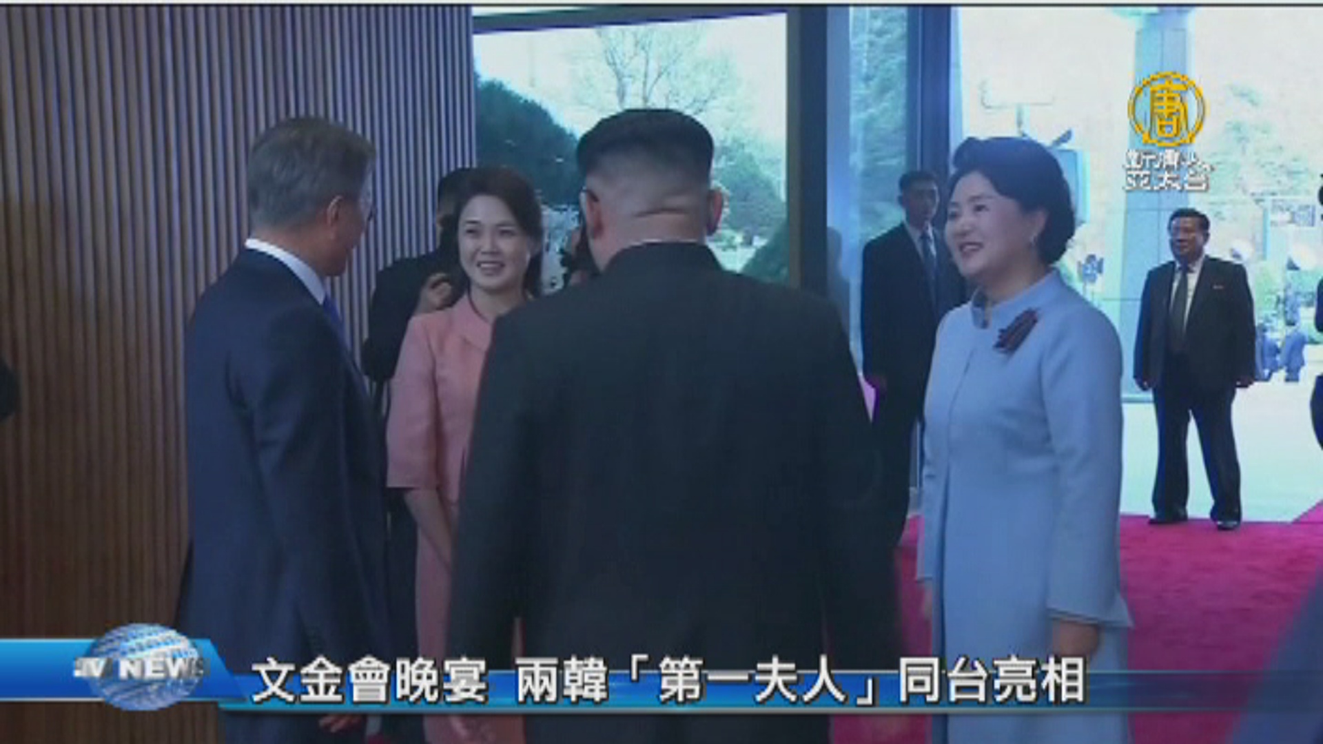 【新唐人亞太台 2018 年 04 月 27 日訊】好,在結束今日的兩韓峰會,簽署板門店宣言後,緊接著就是聯合晚宴。金正恩妻子李雪主,在南韓時間6點15左右抵達板門店,並前往和平之家與南韓第一夫人金正淑會面。畫面上可以看到,李雪主身穿粉紅套裝,金正淑則是一身粉藍,4人在親切握手後,在媒體鏡頭前合照,進入晚宴會場。北韓共有 26 人出席晚宴,南韓共有 32 人出席。金正恩在晚宴結束後,就會返回北韓。
