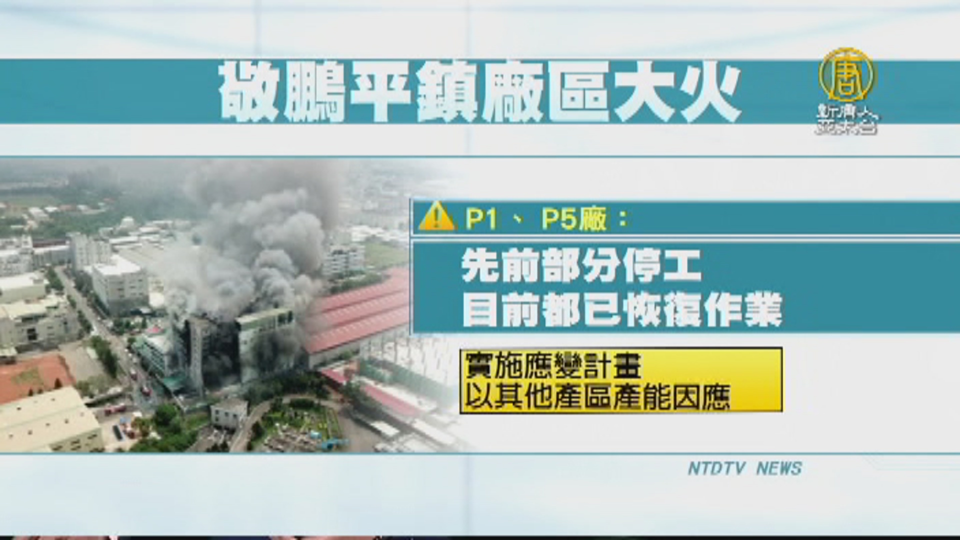 敬鵬公司,失火的平鎮廠區,共有P1、P2、P3、P5廠,P2、P3廠,於火災中受損停工,合計占單月營收15%、金額約新台幣3億元,P1、P5廠先前有部分停工,目前都已恢復作業。敬鵬表示,正實施應變計畫,以其他產區產能因應。至於有市議員質疑,公司高層姍姍來遲,整個晚上都沒有主管,提供警消正確資訊,敬鵬公司則澄清。