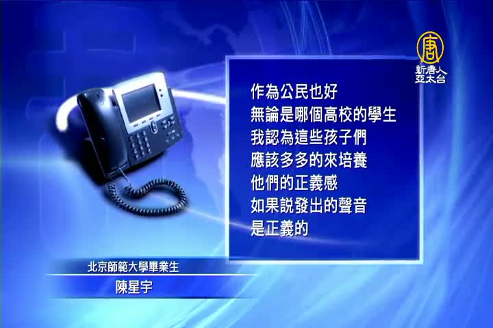 北京師範大學畢業生 陳星宇:「作為公民也好,無論是哪個高校的學生,我認為這些孩子們應該多多的來培養他們的正義感。如果說發出的聲音是正義的,因著這個發出的聲音而承受一些壓力,我認為是值得的。但是有多少人選擇站在這一邊呢?這個需要我們普及對公義對真理的追求,真理啊、公義永遠是要我們去追求的,就不能妥協的。」
