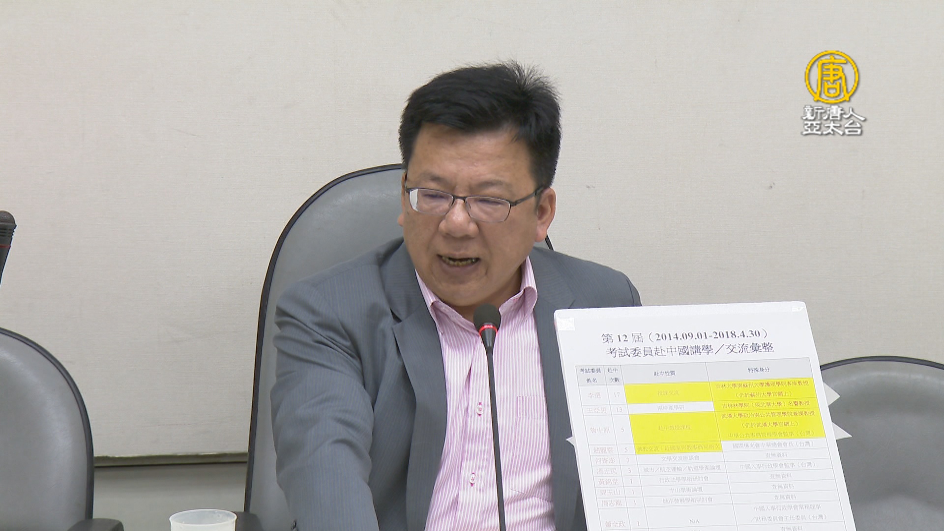【新唐人亞太台 2018 年 05 月 04 日訊】國家考試的考試委員竟然赴中國兼職!有立委爆料,考試委員李選,短短三年17次赴中國講課,並受聘蘇州大學和吉林大學客座教授,另外詐領國科會補助遭判緩刑的考試委員王亞男也到中國13次,其他被點名的還有詹中原和趙麗雲,甚至與中共統戰部國家宗教事務局交流。