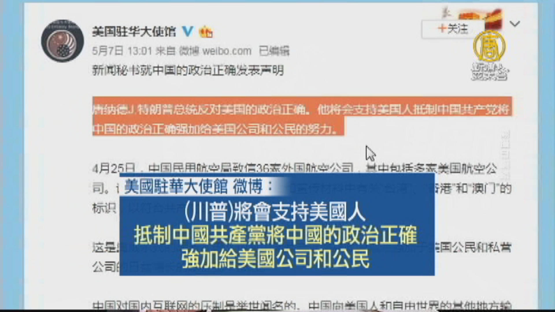 日前,中共當局要求美國航空公司不得將台灣標註為國家,引起美國白宮強硬批評。美國駐華大使館7號將白宮聲明轉貼到官方微博,內容寫到,川普「將會支持美國人抵制中國共產黨將中國的政治正確強加給美國公司和公民。」「中共對國內互聯網的壓制是舉世聞名的。中共向美國人和自由世界的其他地方輸出其審查制度和政治正確的努力將受到抵制。」文末更寫到「我們呼籲中共停止威脅和脅迫美國的航空公司和公民。」