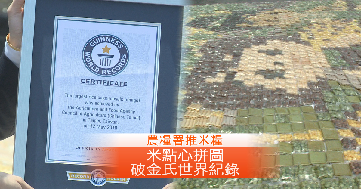 農糧署代表,從認證官手上,接過裱框的金氏世界紀錄證書,這幅以米製點心打造的大型彩色拼圖,打破金氏世界紀錄。農委會為推廣台灣本土米糧,構思半年,在周六動員數十名人力,花費超過六小時,把6000多包米點心,拼成一幅畫。