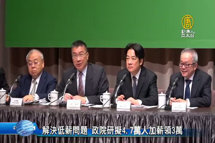 【新唐人亞太台 2018 年 05 月 14 日訊】520總統就職兩周年前,行政院長賴清德,今天針對外界關注的低薪問題,親上火線提出因應,政府規劃五大政策,來提高台灣低薪族薪資,其中要幫全台4.7萬名低薪員工,薪資調高到3萬。
