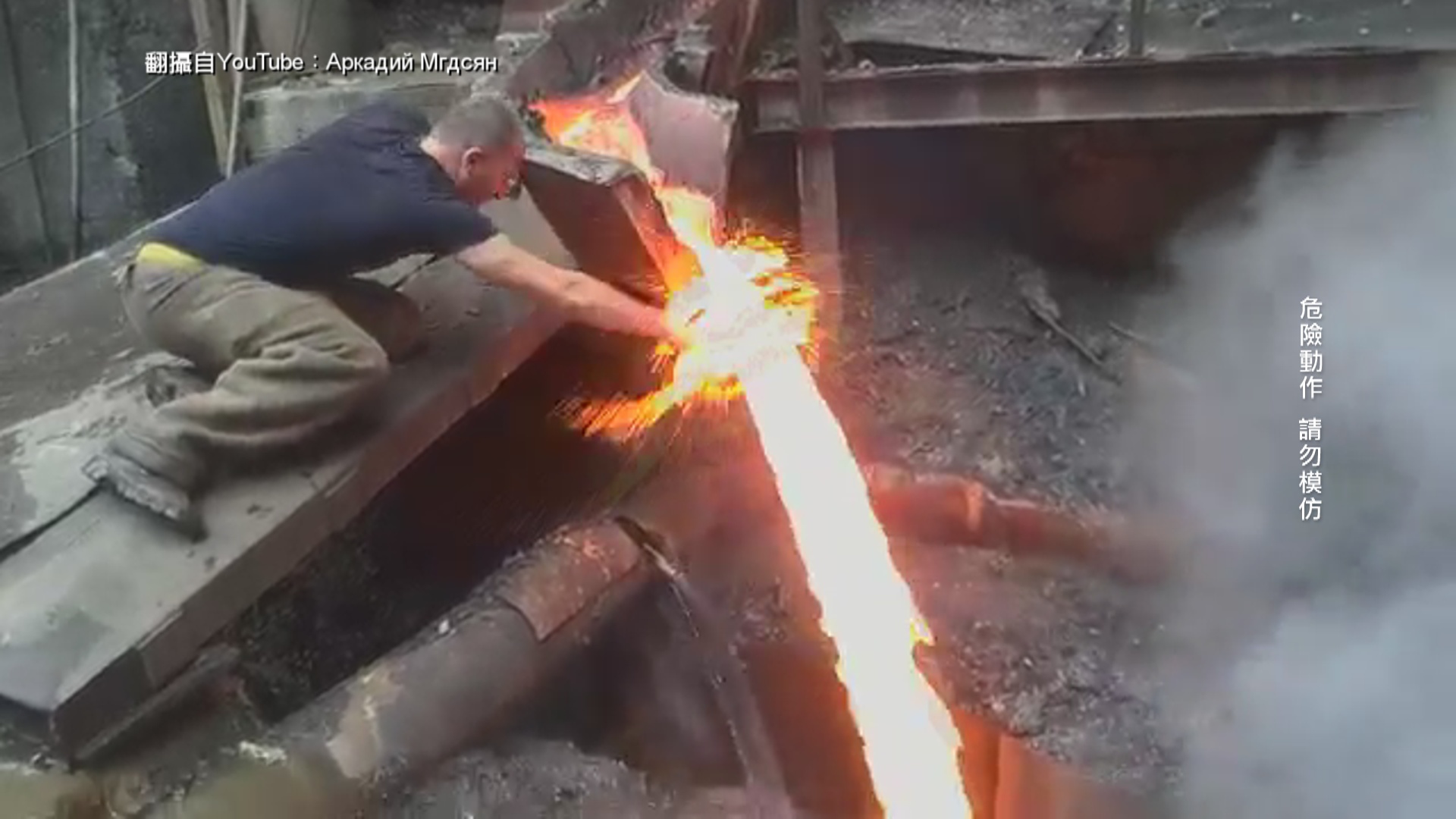 影片中顯示,這名看起來像是在冶煉廠工作的男子,先用鐵棒將熔爐通道清理一下,讓熔化的液態金屬可以順暢地往下流。