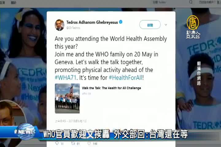 【新唐人亞太台 2018 年 05 月 15 日訊】焦點話題來看到,WHA世界衛生大會21日就要揭幕,台灣在中共打壓下遲遲無法獲得邀請,然而,諷刺的是,5月7日,WHO幹事長譚德塞發表一篇歡迎推文,上頭寫到,你今年要參加WHA嗎?,歡迎加入WHO這個大家庭,讓我們共同促進人人健康。對此,台灣外交部轉發這篇貼文,並回應,「沒有,台灣還在等待邀請。」另外,有許多網友也直接用英文在譚德塞的推文留言,質疑中共施壓下,台灣被忽略。還有網友批評WHO,接受中共虛偽言論時,已經把國際帶向危險。