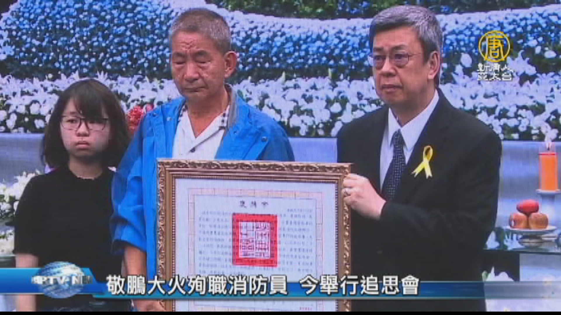 【新唐人亞太台 2018 年 05 月 17 日訊】桃園敬鵬工廠大火,造成埔心分隊游曜陽、平鎮分隊李翰霖、林尉熙、山峰分隊余佳昇、林伯庭、游博瑜等6位消防人員不幸罹難。今天上午在桃園巨蛋舉辦追思會,由副總統陳健仁代表總統頒發褒揚令,場面讓人十分哀戚不捨。