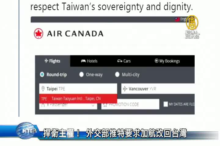 【新唐人亞太台 2018 年 05 月 18 日訊】歡迎回來,中共打壓台灣主權事件層出不窮,日前加拿大航空在中共施壓下,將台北航點改成「台北,中國(Taipei, CN)」。15日,外交部特別用社群軟體「推特」發文,要求加航盡快更正,重視台灣人民的主權和尊嚴。推特下也有網友留言力挺台灣,表示「不再搭加航旅行,直到它改回來」、「台灣不屬於中國」等,不過加航官網至今,仍沒有看到更動。事發後,有加國僑胞在網路發起連署,要求加拿大航空改回台灣,目前已累積超過 3000份連署。