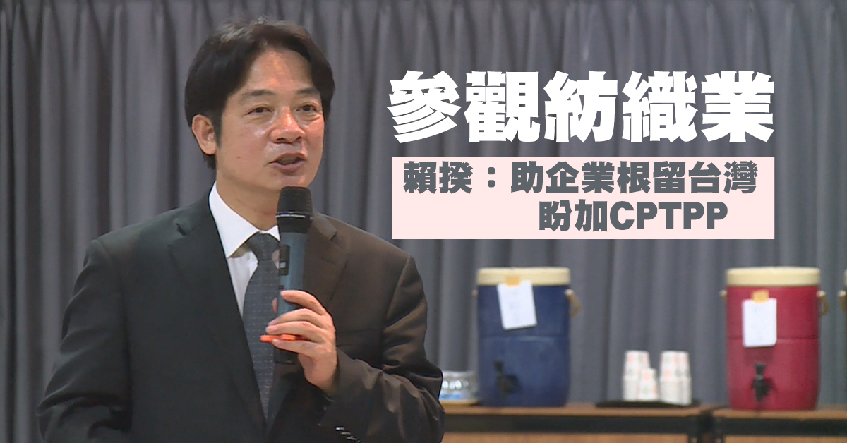 【新唐人亞太台 2018 年 05 月 18 日訊】歡迎回來。行政院長賴清德,下午到彰化紡織大廠參觀,同時進行座談。賴清德說,要讓企業根留台灣,目前正積極尋求加入CPTPP(跨太平洋夥伴全面進展協定),做好準備,希望讓商品在國際上更有競爭力。