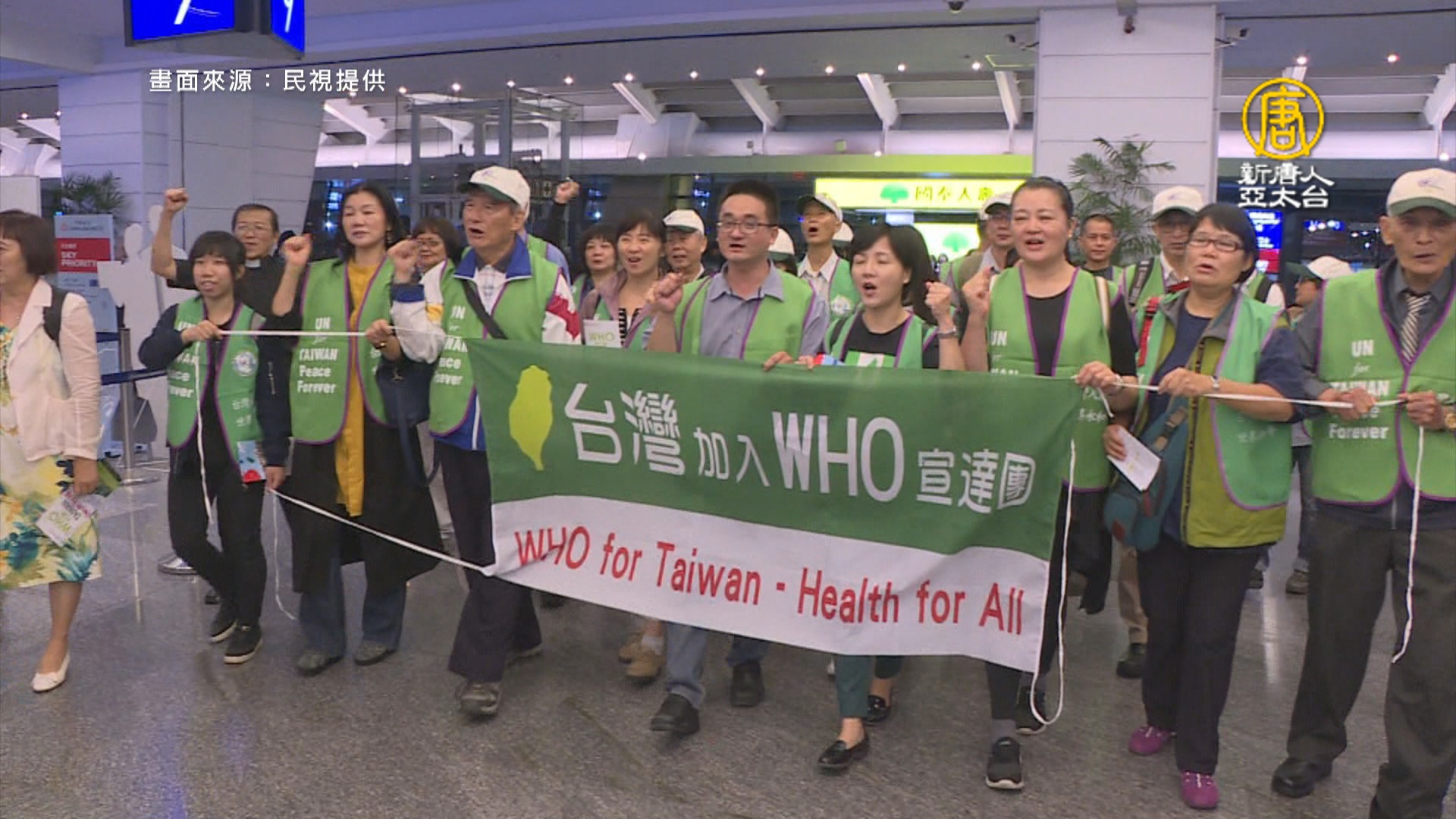 高喊口號,加入WHO台灣向前走,連續15年前往日內瓦的台灣聯合國協進會,選在世界衛生大會召開前,搭機前往WHO總部,表達台灣人心聲。