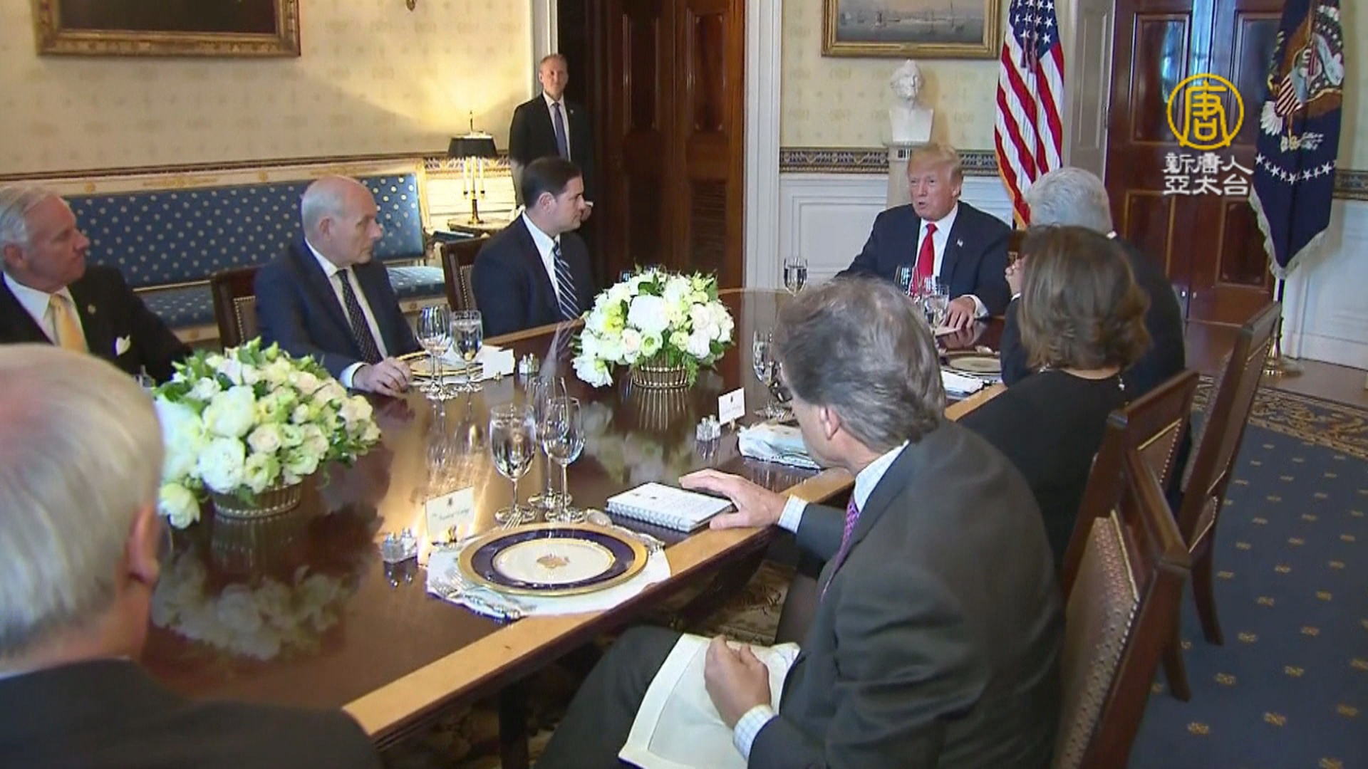 【新唐人亞太台 2018 年 05 月 23 日訊】週一,美國總統川普在白宮與亞利桑那等五個州的州長共進晚餐,商討非法入境和邊境安全問題。