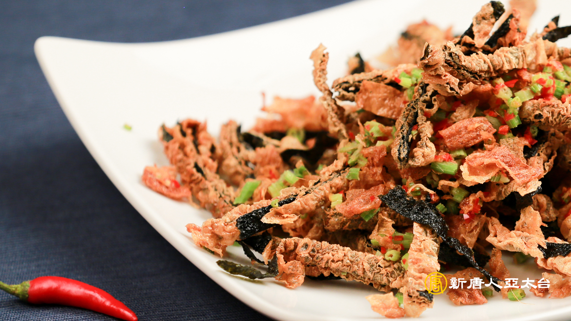 材料:海苔片4張、豆皮6張、紅辣椒末1/2支、薑末20g、芹菜末30g