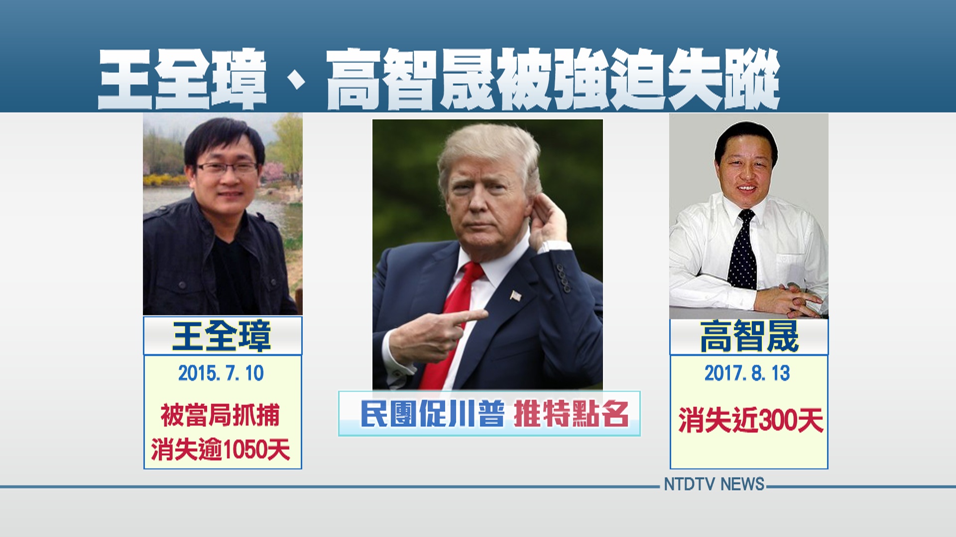 王全璋被中共強迫失蹤一千多天,高智晟又一次被失蹤,已逼近三百天,沒有任何音信,生死未卜。民團表示,努力促使川普總統公開向中共點名。
