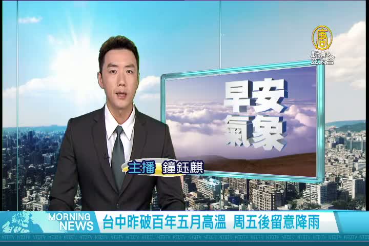 【新唐人亞太台 2018 年 05 月 29 日訊】歡迎您收看5月29日的早安新唐人,我是鐘鈺麒,先來帶您關心今天的天氣情況。持續炎熱,昨天勞動部首度鬆口會思考高溫假,而昨天,全台最高溫出現在台中36.3度,這也是當地122年來5月最高溫紀錄。今天,各地高溫,約在32度到36度,北部、東半部地區要留意午後陣雨,周五到下周一,受鋒面影響,全台都有降雨機率。帶您一起來看到國際媒體重要訊息。