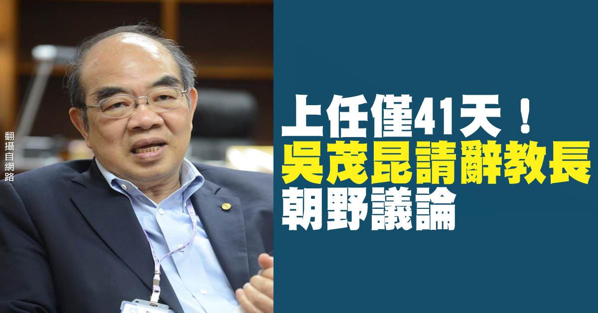 2018-05-29 20:44:33再來關心,政治焦點,行政院(29日)證實,教育部長吳茂昆主動請辭獲准,任期只有41天,成為台大校長人選管中閔案延燒以來,第二位下台的教長。