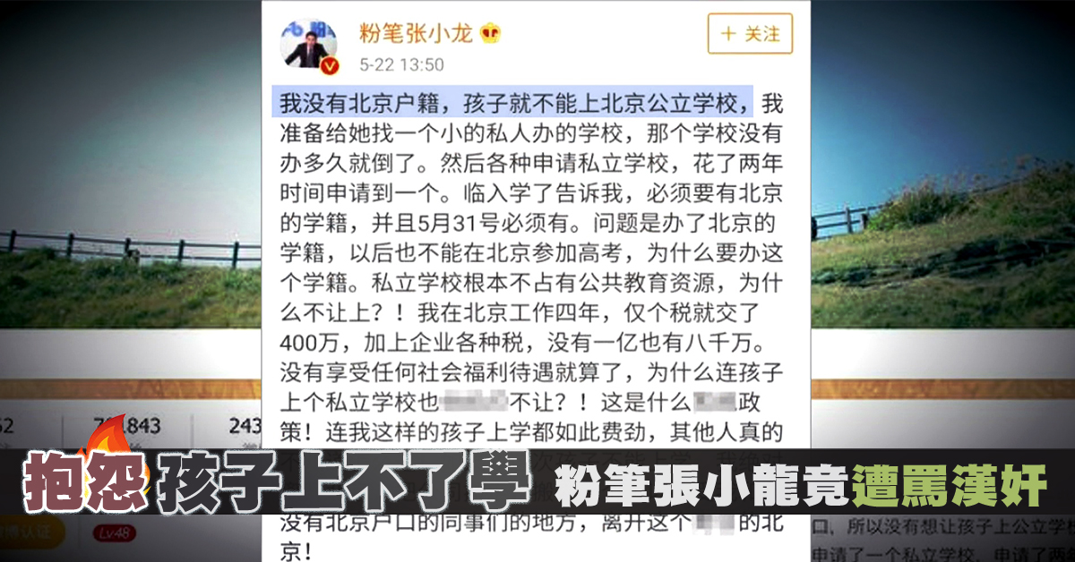 抱怨孩子上不了學 粉筆張小龍竟遭罵漢奸