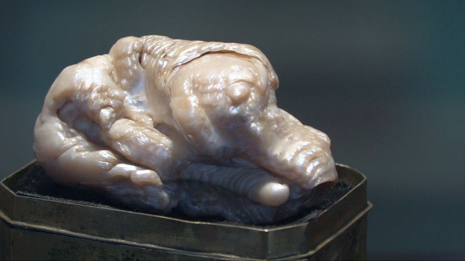 珍珠專家 Hanco Zwaan: 「今天的很多珍珠是人工養殖的, 可以說是人造的。而這顆珠完全是江河裡面的貝殼天然孕育的。」