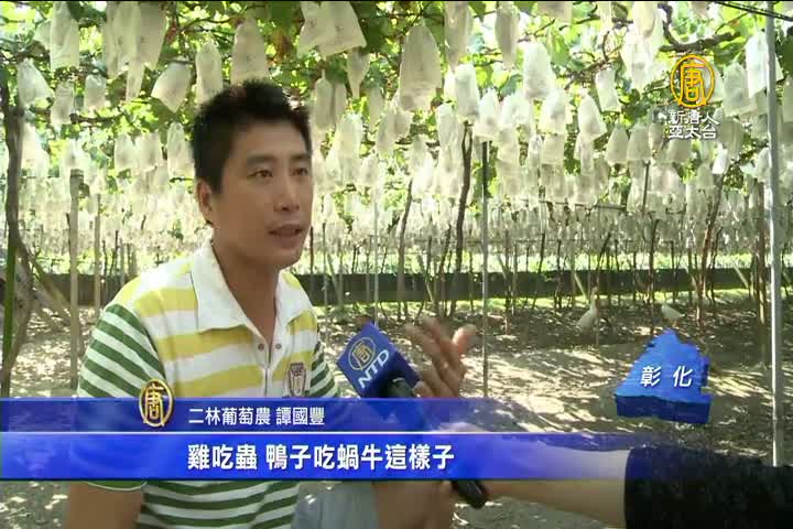 【新唐人亞太台 2018 年 06 月 02 日訊】觀眾朋友去過葡萄園嗎?葡萄農友往往都是低頭作業,小心呵護,避免撞到葡萄串。不過,在彰化二林的一個葡萄園裡,可以看到鴨子跟鵝四處奔跑,主人希望,透過家禽來除草除害蟲。