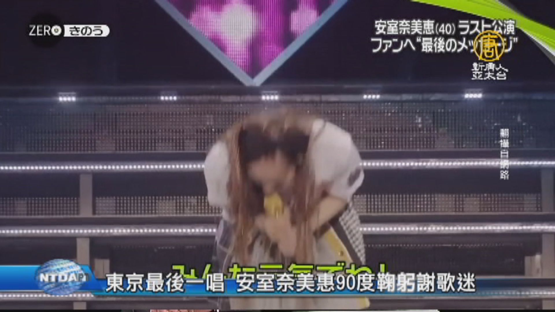 【新唐人亞太台 2018 年 06 月 05 日訊】日本歌手安室奈美惠,將於今年9月16日引退,從二月起開跑最後一場巡演,上周末在東京巨蛋舉行最終場,唱到最後忍不住流下不捨的淚水,並深深一鞠躬感謝粉絲們25年來的熱愛。